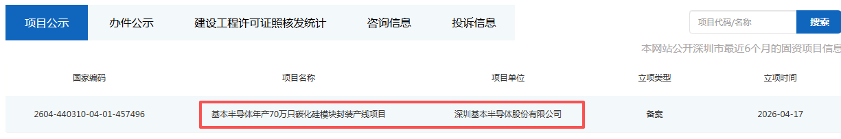4月17日,深圳投资项目在线审批监管平台发布了深圳基本半导体股份有限公司年产70万只碳化硅模块封装产线建设项目备案公示。 图片来源:深圳投资项目在线监管平台信息截图 该项目由基本半导体全资子公司基本封装测试(深圳)有限公司实施,落地深圳市坪山区。项目总投资超8亿元,占地面积844...  [详内文]